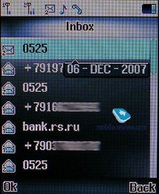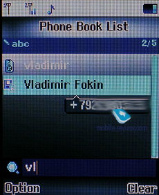 В списке контактов отображаются как контакты с карты памяти, так и SIM-карты. Поиск осуществляется в телефонной книге побуквенно либо по имени. В списке контактов рядом с именем абонента отображается только мобильный номер телефона, а для просмотра остальных номеров надо выбрать контакт и нажать клавишу подтверждения. Быстрый доступ к списку контактов осуществляется нажатием правой функциональной клавиши из режима ожидания. Фото, присваиваемое абоненту, не может превышать по объему 20 Кб, а вот для видеороликов такого ограничения нет. Во время входящего вызова фото отображается не на полный экран.