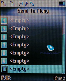 Сообщения. В памяти аппарата может храниться до 50 сообщений. Аппарат поддерживает стандарт EMS, в памяти телефона уже есть набор предустановленных картинок, анимаций и мелодий. Предусмотрена работа со склеенными сообщениями, при наборе максимальный объем может достигать 612 символов. Есть 10 шаблонов, которые можно менять по своему усмотрению. Предусмотрена мультирассылка сообщений (до 10 номеров), а также отправка сообщения группе абонентов (из телефонной книги).