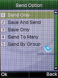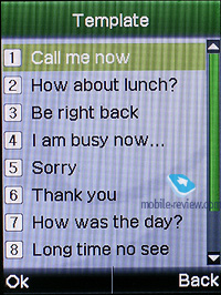 Во время входящего вызова фотографии, присвоенные контакту/группе, отображаются не на полный экран, а в окне по центру экрана (относится как к внешнему, так и к внутреннему дисплеям). В это же время видеоролик, присвоенный абоненту, отображается на полный экран. Сообщения. В памяти аппарата может храниться до 50 сообщений. Аппарат поддерживает стандарт EMS, в памяти телефона уже есть набор предустановленных картинок, анимаций и мелодий. Предусмотрена работа со склеенными сообщениями, при наборе максимальный объем может достигать 1224 символов. Есть 10 шаблонов, которые можно менять по своему усмотрению. Предусмотрена мультирассылка сообщений (до 10 номеров), а также отправка сообщения группе абонентов (из телефонной книги). Редактор MMS-сообщений довольно прост и понятен в работе. Можно создавать шаблоны сообщений. Максимальный объем отправляемого MMS-сообщения не может превышать 100 Кб.