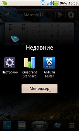 ![]() Программная платформаСмартфон работает на операционной системе Google Android версии 2.3.3. Обновления для Android ICS, скорее всего, не будет. ![]() В качестве оболочки используется бесплатный лончер Яндекс.Shell. Одна из его «фишек» - объемный рабочий стол, активируемый центральной механической кнопкой. Есть несколько виртуальных рабочих столов, множество виджетов и настроек, в том числе можно сделать так, чтобы внешний облик стал, как на планшетах: горизонтальная ориентация, миниатюрные ярлыки и так далее. Я использую эту оболочку практически на всех устройствах с Android – удобная, быстрая и не «глючная».