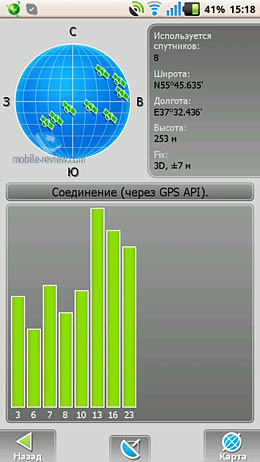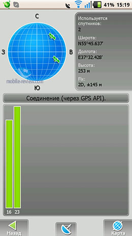 После запуска приложения соглашаемся со всеми запросами, которые предложит навигация. «Холодный» старт определения координат «Турбо» – около минуты (довольно шустро), «горячий» – до 5-10 секунд. К сожалению, в помещении спутники определяются неохотно, поэтому навигатор с трудом нашел только два-три. Однако на открытом пространстве в ясную погоду IQ285 определил больше 8 спутников.