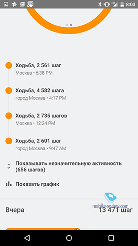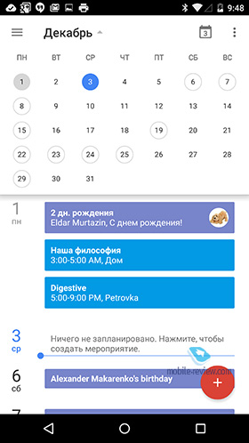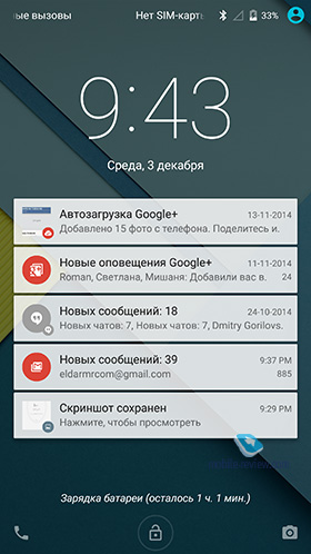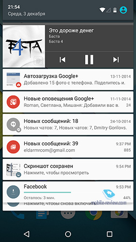 Цифровой зум до х4. Поддерживается запись 4К, но по умолчанию видео пишется в 1080р (30 кадров в секунду). Одним словом, камера далеко не лучшая, но вполне хорошая, выше среднего уровня. Принцип работы такой же, как в iPhone: достал и сфотографировал. Программные особенности, или чистый Android 5О том, какие изменения приносит Android 5, можно посмотреть наше видео. Из мелочей, которые мне не нравятся по сравнению с предыдущей версией, отсутствие выбора дат в информации о передаче данных (меню настроек). Отсутствие информации о том, сколько телефон проработал с последней зарядки, ее нет в явном виде, в меню показывается предположение, сколько телефон еще проработает. Это мелочи, но они всегда помогали мне в работе, теперь это стало не так просто. Вы могли видеть разные приложения в Material Design на других устройствах, Google обновил почти все системные программы. Но есть одна закавыка, не имея перед глазами изначально созданного на Android 5 устройства, вы не поймете, как все это работает вместе. На примере Nexus 6 могу отметить, что получилось не просто симпатично, а очень и очень неплохо. Есть цельное впечатление, все работает вместе хорошо. Ниже приведем скриншоты, чтобы у вас сложилось впечатление об интерфейсе на этом устройстве.