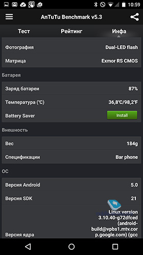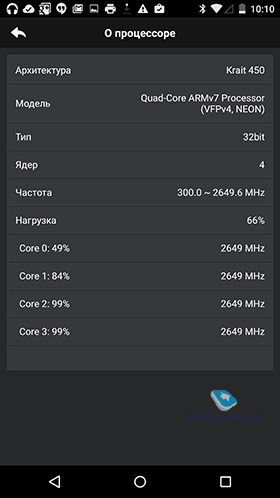 Вторая фишка намного полезнее, это быстрая зарядка аккумулятора, которая получила название Turbo Charge, соответствующая надпись есть на зарядке. В основе лежит фирменная технология Qualcomm под названием Quick Charge 2.0, она же используется в Note 4. Если Samsung заявляет о том, что за 30 минут заряжает 50 процентов аккумулятора, то в Motorola говорят о 15 минутах и 6 дополнительных часах работы. Сути это не меняет, технология одна, но отличаются схемы зарядки и ток. В Motorola несъемный аккумулятор, поэтому вариант зарядки сделали более щадящим, общее время составляет порядка 1 часа 35 минут (1 час 20 минут у Note 4). С обычной зарядкой Motorola на 5В, 1.5А вы будете заряжать Nexus 6 около 3 часов 45 минут. В сухом остатке хочу сказать, что полные сутки работы для Nexus 6 – это реальность. Даже при большой нагрузке, то есть около 3 часов работы экрана в разных программах плюс другой активности, передаче данных. Вполне сравнимо с Note 4, но до двух дней работы тут не выйдет, особенно если вы будете активно пользоваться передачей данных. Память, чипсет, производительностьМодель выпускается в двух вариантах – на 32 и 64 ГБ. У меня был аппарат на 32 ГБ, в нем свободно около 25 ГБ для всех ваших данных, карт памяти традиционно для линейки Nexus нет, что для аппарата такого класса на Android является серьезным минусом. Объем оперативной памяти – 3 ГБ, этого более чем достаточно для всех текущих задач. В аппарате стоит чипсет от Qualcomm – Snapdragon 805, он четырехъядерный с максимальной частотой 2.7 ГГЦ (28 нм техпроцесс), графический сопроцессор Adreno 420 (одна из вариаций Note 4 имеет ровно ту же начинку). В синтетических тестах это устройство показывает одни из лучших результатов.
