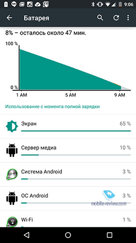 Дисплей Nexus 6 является его слабым местом, хотя все в мире относительно и экран чуть выше среднего по уровню. Другое дело, что он уступает своим одноклассникам. К нему быстро привыкаешь, и он становится привычным, но берешь в руки другие фаблеты и снова видишь эти отличия. Олеофобное покрытие неплохое, следы от рук остаются, но в том же количестве, что и на других устройствах этого класса. Углы обзора неплохие, цвета могут незначительно инвертироваться, но этого почти не видно. Никаких особых режимов энергосбережения, характерных для AMOLED-экранов последних поколений, тут нет. Из возможных минусов отмечу своего рода скандал с выгоранием точек в новых Nexus 6, который начался вот с этого видео. На практике это не выгорание точек, а именно особенности экрана, при смене картинки на другую, со временем отпечаток также изменится. То есть эффект не будет наблюдаться. К слову сказать, это одна из причин, по которой нет режима энергосбережения, в нем эти дефекты будут хорошо заметны. Жаль, но у Motorola просто нет доступа к последним типам экранов, им приходится выбирать лучшее из доступного. И такие экраны сильно уступают тем, что стоят в продуктах от Samsung. Достаточно просто сравнить их в жизни, чтобы увидеть эту разницу. АккумуляторВстроенный Li-Ion аккумулятор имеет емкость 3220 мАч, любопытно, что ровно такой же по емкости аккумулятор в Galaxy Note 4. В Motorola заявляют о том, что при полной нагрузке устройство способно проработать сутки. Не уточняя, как именно измеряют полную нагрузку, что входит в это понятие и так далее. Без деталей судить об этом сложно, но могу отметить, что в компании скорее правы, чем нет. Начну с того, что самым слабым местом в работе телефона являются игры и проигрывание видео, это напрямую связано с дисплеем и его энергопотреблением в этих режимах. Если для видео можно добиться 7-7.5 часов работы (максимальная яркость экрана), то для игр это порядка 4-5 часов. Грустно, так как конкуренты крутят видео минимум 10 часов, а то и больше. Но на этом грусть заканчивается, так как в обычных приложениях, при типичном использовании смартфона никаких проблем не наблюдается, а есть только плюсы. Общее время работы в таком смешанном режиме больше, чем у Note 4, примерно на 20-30 процентов. И думаю, что это напрямую связано с Android 5, так как в этой версии сильно улучшили энергопотребление.