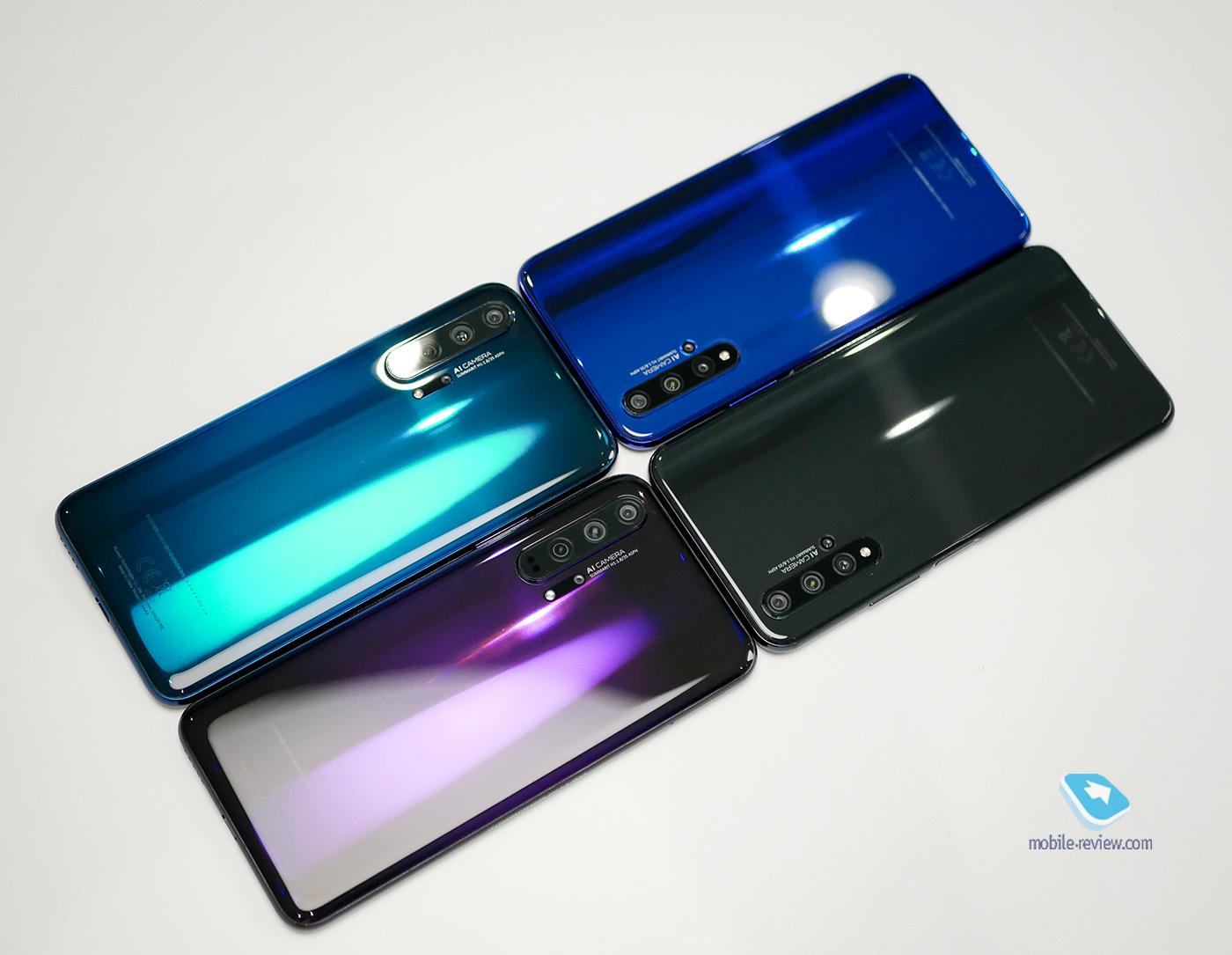 Смартфон Honor 20 получит цвета «midnight black» и «sapphire blue», а Honor 20 Pro – «phantom black» и «phantom blue». В первом случае это темно-серый и синий, во втором – фиолетовый и темно-голубой. Кроме того, под разными углами цвет немного изменяется от светлых до темных тонов. Тыльная панель выполнена из стекла с нанесенным на него олеофобным покрытием. Более конкретных данных на момент написания текста не было. На фронтальной панели сверху расположен динамик. Скорее всего, рядом должен быть индикатор событий, так как режима AOD в этих моделях нет ввиду наличия IPS-матриц. Снизу – микрофон, USB-C и динамик. Здесь его называют «Virtual 9.1 surround sound». Да, звук богатый и насыщенный, громкий и чистый, но без использования нескольких динамиков добиться объемного звучания невозможно. Слева расположены салазки для двух сим-карт. Справа – кнопка питания, в которую встроили сканер отпечатков пальцев (интересно, как к этому отнеслось подразделение Sony Mobile?) Чуть выше – клавиша-качелька регулировки громкости. На верхнем торце находятся второй микрофон и ИК-передатчик. А сзади у смартфонов творится вакханалия: очень крупный модуль с тремя объективами со вспышкой у Honor 20 и лазерной фокусировкой у Honor 20 Pro, а рядом встроили еще одну камеру, на мой субъективный взгляд – настоящий рудимент (почему это так, я напишу в разделе о камерах). В случае с Honor 20 камера обособлена, в случае с Honor 20 Pro она имеет общую площадку со вспышкой. Выглядит это как нагромождение всего и вся. Итого: визуально крупные смартфоны с прикольно переливающейся задней крышкой, огромным горбом в виде модуля камер и рудиментарной дополнительной камерой.