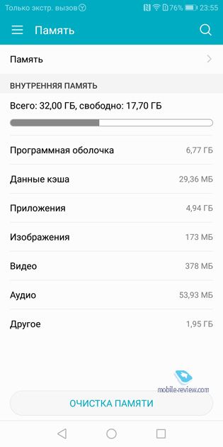 К GPS и ГЛОНАСС также нет претензий – все работает как часы. В наличии типичный набор «ударника»: Wi-Fi без ac и двух диапазонов, Bluetooth версии 4.2, USB версии 2.0 с «хостом». Память и карта памятиПамяти немного пожалели, поэтому придется пользоваться только 3 ГБ ОЗУ и 32 ГБ (доступно около 20 ГБ) встроенной памяти. Оперативная память достаточно шустрая – 5 000 МБ/с, а вот встроенная – обычная, 173/100 МБ/с. Поддерживаются карты памяти до 256 ГБ, но только вместо одной из симкарт.