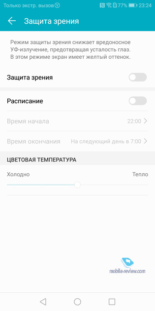 Honor 9, P-Smart и Nova 2i ДисплейВ этом устройстве используется экран, диагональ которого составляет 5.65 дюйма. Физический размер – 64х128 мм. Присутствует антибликовое покрытие, достаточно эффективное. Разрешение дисплея Honor 9 – FullHD+, то есть 1080x2160 точек, соотношение сторон – 18:9 (2:1), плотность – 427 пикселей на дюйм. Матрица от IPS без воздушной прослойки on-cell. Углы обзора экрана максимальные, никаких искажений. Яркость подсветки высокая, на свету экран не слепнет В настройках есть пункт с цветовой температурой. Работает функция защиты зрения: можно выбирать не только время включения и выключения, но и интенсивность. Впервые на аппаратах Huawei (могу ошибаться) появился пункт выбора разрешения: