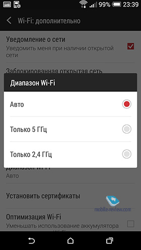Для синхронизации с ПК и передачи данных используется комплектный кабель microUSB. В смартфоне есть поддержка USB On-The-Go (USB OTG) – к аппарату можно подключать через переходник флешки и другие накопители. Bluetooth. Встроенный модуль Bluetooth 4.0 с поддержкой A2DP и apt-x. Wi-Fi (802.11а/b/g/n). В HTC Desire EYE двухдиапазонный Wi-Fi модуль. Можно оставить его работать в автоматическом режиме, а можно вручную указать рабочую полосу частот для Wi-Fi – только 5 ГГц или только 2.4 ГГц. Модуль работает без нареканий. В дополнительных настройках есть режим максимальной производительности (снятие галочки с «Оптимизация Wi-Fi»), а также включить или отключить автоматическое подключение к последней сохраненной активной сети. При работе модуля аппарат не нагревается.