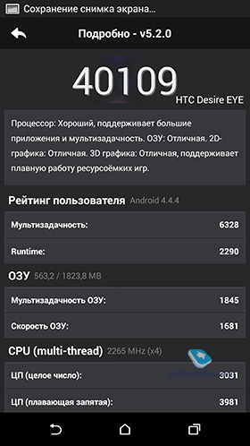В смартфоне есть обычный режим энергосбережения, включив который, можно сэкономить заряд аккумулятора, понизив уровень яркости экрана, отключив передачу, вибрацию. Также есть максимальный режим энергосбережения. В данном режиме процессор работает на пониженной частоте, отключается большинство сенсоров и датчиков, при выключенном экране не ведется передача данных, отключается вибрация и понижается уровень яркости экрана. Но самое главное – в этом режиме вам доступен ограниченный набор приложений, а именно телефон, почта (пока только настроенная через фирменный клиент), сообщения, календарь и калькулятор. Запускать другие программы или добавлять новые в список разрешенных для работы в данном режиме нельзя. Платформа, памятьСмартфон построен на платформе Qualcomm Snapdragon 801 с четырехъядерным процессором частотой 2.3 ГГц, графическая подсистема (GPU) – Adreno 330. В устройстве 2 ГБ оперативной памяти и 16 ГБ встроенной памяти для хранения пользовательских данных, также есть слот под карту памяти (гарантирована поддержка карт до 128 ГБ), поэтому говорить о недостатке памяти смысла нет. Смартфон быстрый, и добавить мне просто нечего: никаких подлагиваний, задержек, замедленной прорисовки анимации здесь нет, «задумчивости» интерфейса также нет. Сравнить по плавности работы новый HTC Desire EYE можно с One (M8), это примерно такой же уровень. Ниже приведены скриншоты тестирования нового Desire EYE в Antutu Benchmark.