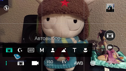 Автоматический режим съемки (Auto). В режиме «Авто» можно настраивать значение ISO, экспозиции (EV), баланса белого и выбрать один из 15 накладываемых эффектов. В настройках камеры также устанавливается соотношение сторон кадра: широкоформатный (16:9), обычный (10:7) или квадрат (1:1), сетка для удобства съемки, сохранение геометок, автоспуск, значения контрастности, насыщенности, резкости изображения и сила ретуши для снимков. Все настройки можно сохранить в отдельный профиль с собственным названием и включать их при необходимости. Профилей может быть несколько.