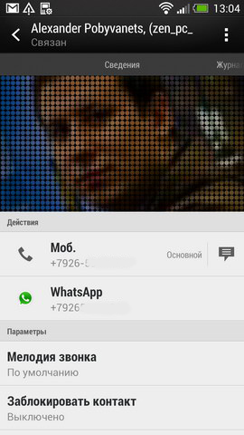 Кстати – в HTC придумали очень изящное решение проблемы фотографий контактов с низким разрешением. Если у вас в адресной книге есть контакты с такими «фотками», то когда вы открываете карточку контакта или начинаете ему звонить (или он звонит вам) – вы видите фотографию также на половину экрана, но со специальным эффектом, будто смотрите на нее сквозь решетку (не знаю, как лучше объяснить, см. на скриншоты).