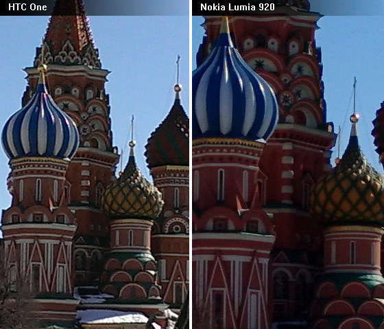 Сравнение снимков, сделанных на HTC Butterfly и HTC One Судя по полученным фотографиям, HTC Butterfly хорошо справляется с автоматическим подбором баланса белого, чего не скажешь о «Ван». Детализация примерно одинаковая, с той лишь разницей, что у «Бабочки» больше разрешение, поэтому, как ни печально за One, некоторые мелкие детали лучше различимы именно на Butterfly. На месте HTC я бы не мудрил: использовал бы камеру от Butterfly и «похимичил» бы с алгоритмами обработки изображения. Ночные кадры HTC Butterfly (режим «Авто») и HTC One («Авто»/«Ночной режим»): Фото при домашнем освещении HTC Butterfly и HTC One: Макро HTC Butterfly и HTC One: Текст HTC Butterfly и HTC One: Сравнение снимков, сделанных на Nokia 920 и HTC One Первое, что стоит отметить, так это разные углы обзора: у Nokia – 26 мм, а у HTC – 28 мм. «Нокиевская» оптика чуть менее качественная, поэтому на краях легко заметно слабое замыливание деталей. Второе – насыщенность: Nokia немного «приукрашивает» изображение, HTC – наоборот, пытается настраивать параметры камеры на более естественные оттенки, но выходит как-то не очень: изображение недополучает цвета, поэтому и выглядит несколько тускловато. Что касается детализации, то она была примерно одинаковой, если бы у HTC была бы 8 МП камера. В данном случае, кадры с Nokia Lumia 920 выходят чуть более детализированными: если приблизить фото до 100%, то можно видеть мельчайшие детали. В целом, кадры, сделанные на HTC выглядят так, будто 8 МП или 13 ПМ снимок «ресайзнули» до 4 МП и применили контурную резкость. Кропы: