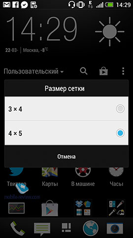 Кстати, чтобы поменять ярлыки в фиксированной нижней панели в Sense 5, нужно зайти в меню программ и перетаскивать в эту панель иконки именно отсюда, удалять из панели иконки можно также только находясь в окне «меню приложений». Если попробовать удалять ярлык из фиксированной панели, находясь на одном из экранов оболочки, ничего не выйдет – ярлык просто продублируется на рабочем столе. Зачем простая возможность изменить набор ярлыков в этой панели сделана так неочевидно – не знаю. Было изменено меню программ, если в предыдущих версиях Sense это было классическое окно с фиксированной матрицей из значков, то в Sense 5 можно выбирать размер сетки: 3 x 4 или 4 x 5. Также в этом окне есть виджет часов и погоды сверху, убрать его нельзя. В меню программа можно сортировать их по алфавиту или по недавно добавленным. А также просто разместить в удобном для вас порядке. Еще одно новшество меню приложений – теперь здесь можно создавать папки.