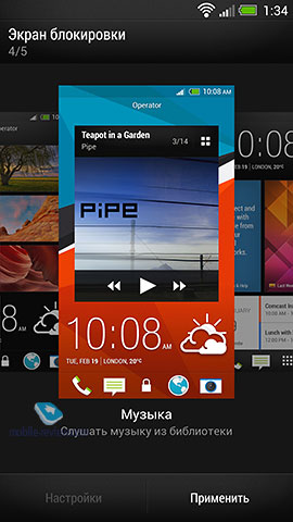 В HTC Sense 5, как и в прошлых версиях оболочки, можно выбирать один из нескольких вариантов экрана блокировки: с часами и погодой, с панелькой управления музыкой, с фотоальбомами, с панелями последних событий или, можно просто убрать экран блокировки. Недостаток – на экране блокировки нельзя поменять набор стандартных ярлыков, то есть, как стояли там внизу ярлыки «Телефон», «Сообщения», «Браузер» и «Камера», так и будут стоять.