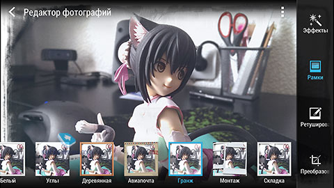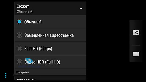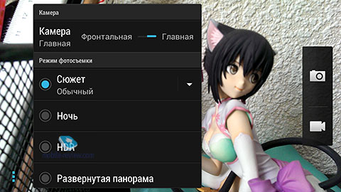 Интерфейс камеры максимально похож на таковой для HTC Butterfly, все настройки доступны из специального всплывающего меню, более важные расположены сверху, второстепенные – ниже. Максимальное разрешение снимка 2688x1520 точек для широкоформатного режима.