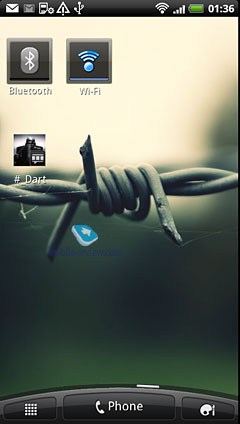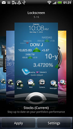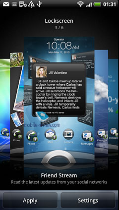 Изменены эффекты пролистывания экранов, появился режим «Dock Mode», в котором на экране отображается погода, время и другая важная информация. ![]() Главное новшество по сравнению с предыдущими версиями интерфейса (включая HTC Sense 2.1) – новый экран блокировки. Здесь есть область с четырьмя ярлыками программ и кольцо внизу. Если потянуть кольцо к центру экрана – смартфон просто разблокируется. А если потянуть кольцо на один из ярлыков программ или сам ярлык начать тащить в кольцо – откроется данная программа. Удобная функция, которая была реализована в Meizu M8 и M9, на других аппаратах я ничего аналогичного не встречал.