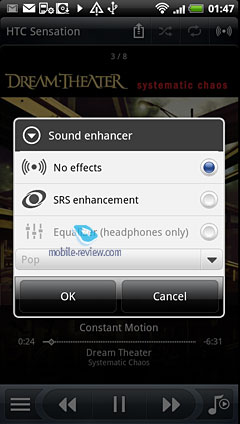 Запуск приложения HTC Navigation происходит при помощи «Автомобильной панели» или программы Locations. Это полноценный навигационный софт с поддержкой точек интереса (POI), журналом маршрутов и возможностью прокладывания маршрутов. В моем образце HTC Sensation не было доступных карт (потому и скриншотов программы нет), в предыдущих моделях была обзорная карта России и демонстрационная 30-ти дневная карта городов России. Для программы можно купить любые из доступных карт, покупка производится прямо через интерфейс программы, с помощью банковской карты (VISA, Master Card, American Express, Diners Club). Также можно купить карты в интернете на сайте разработчика, а в устройстве затем просто ввести специальный код ваучера и скачать уже купленную карту. Приятно, что можно выбрать один из нескольких вариантов лицензии при покупке, на 30 дней, на год или бессрочную. Порядок цен вы можете оценить сами на примере стоимости карт России (5,99 USD на 30 дней, 24,98 USD на год , 37,99 бессрочная лицензия). ЗвукЯ слушал на HTC Sensation музыку, однако поймать для оценки качества звука Илью Тараканова мне не удалось. Так что вам придется поверить мне на слово. Звук в смартфоне хороший, мой испорченный лапой медведя слух ставит HTC Sensation по звуку на одну ступеньку с Apple iPod Classic. ![]() В музыкальном проигрывателе появилась возможность загрузки обложек альбомов в ручном или автоматическом режиме, для выбранного альбома или для всей музыкальной библиотеки. Удобная функция, с помощью которой я сразу обновил обложки низкого качества для нескольких альбомов до обложек высокого качества.