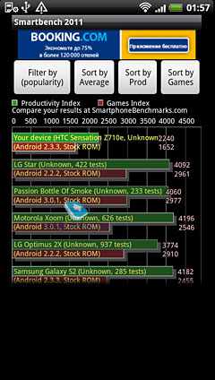 Это первый аппарат компании HTC на базе двухъядерного процессора и главный вопрос, который наверняка многих интересует, насколько же заметна разница в скорости работы между одноядерными устройствами компании и новым флагманом? По моим ощущениям, которые сложились за время эксплуатации HTC Sensation, игры на нем, просмотра видео и запуска различным программ, а также подглядывания интернета – по скорости работы двухъяденый флагман почти не отличается от, например, HTC Incredible S. Также он почти не отличается от Samsung Galaxy S II. Это не значит, что все перечисленные смартфоны медленные, это значит, что в любом из них комфортная скорость работы и лично я «на глаз» просто не могу отличить повышение производительности для обыкновенной эксплуатации смартфона между HTC Incredible S и HTC Sensation. В смартфоне всего 1 ГБ внутренней памяти для хранения данных, а также слот под карту памяти формата microSD. В комплекте с аппаратом идет карта на 8 ГБ. На мой взгляд, компания поступила опрометчиво, укомплектовав смартфон карточкой всего на 8 ГБ, если бы у него была встроенная память, то все понятно, но встроенной памяти мало на фоне конкурентов и хотелось бы видеть в качестве компенсации карту большого объема, например на 16 ГБ. Но это скорее из разряда моих ворчаний. Аппарат без проблем проигрывает видео небольших разрешений, например 700x400 или около того при помощи стандартного плеера. Смартфон поддерживает стандартные для Android видео-кодеки, а также Xvid. Видео в разрешении QHD, то есть 960x540 можно попробовать смотреть при помощи стороннего плеера, например, RockPlayer, но у меня несколько тестовых роликов шли не особенно комфортно, с задержками и периодическими дерганиями. На всякий случай приведу результаты тестов в нескольких бенчмарках, на мой взгляд, эти тесты не отражают реальной производительности (разве что в играх), но, вдруг вам будет интересно.