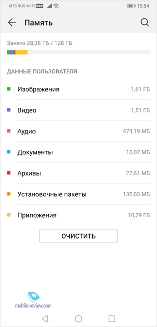 Меню «Память». Если нажать на «Очистка», то откроется дополнительное меню.