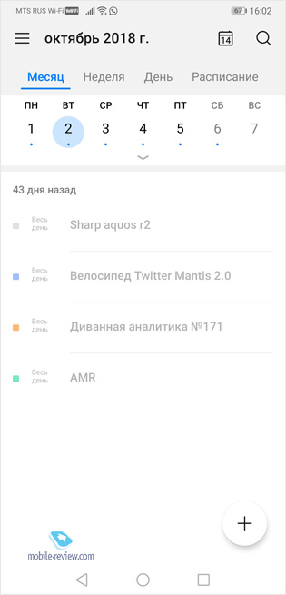 Календарь. В новой версии EMUI 9 немного изменили положения элементов: месяц, неделя и так далее теперь расположены не снизу, а сверху. Для добавления записи появилась круглая кнопка с плюсиком. Информация отображается наглядно: в режиме «Месяц» можно переместить ползунок в центре экрана вниз и тем самым раскрыть весь список запланированных дел. Раньше было то же самое, только из-за отсутствия ползунка приходилось догадываться о такой интересной функции.