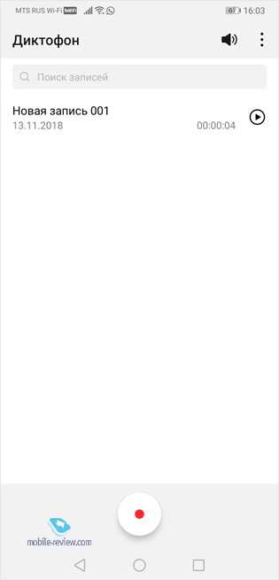 Диктофон. Он стал значительно проще: убрали все элементы в нижней части панели управления. Осталась единственная кнопка записи. Во время записи на экране появляется визуальное представление звука. Насколько я понял, из EMUI убрали фото-тег.