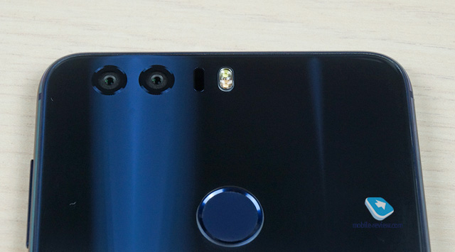 С обратной стороны – два «глаза» камер, лазерная подсветка автофокуса, двойная светодиодная подсветка теплого и холодного свечения и круглый сканер отпечатков пальцев, слегка утопленный в корпус. Также он является механической кнопкой.