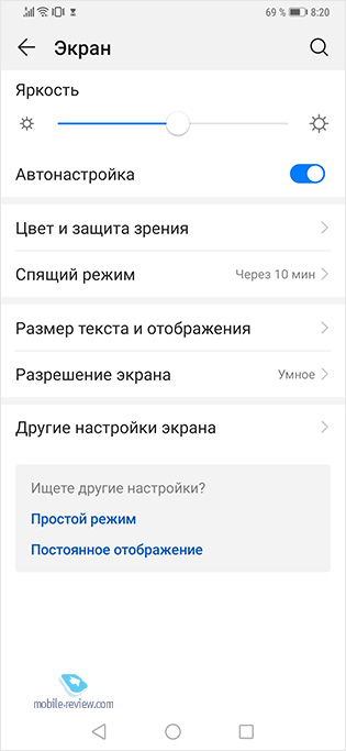 Автонастройка яркости как обычно для Huawei очень агрессивна, экран в большинстве ситуаций темноват. Но постепенно ситуация выправляется, если вы постоянно регулируете этот параметр, у меня на это ушло две недели. Теперь яркость комфортна, но сказывается это как вы понимаете на времени работы смартфона. На фронтальной панели находится RGB-датчик освещения, он может подстраивать световую температуру под условия внешнего освещения, настройка в меню называется “естественный тон”.