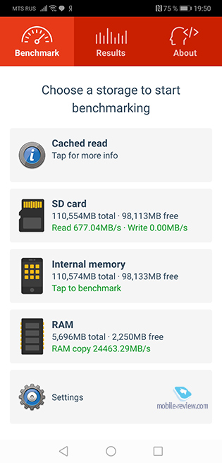Оперативной памяти в Mate 20 6 ГБ. После теста скорости ОЗУ я некоторое время всматривался в результат, который составил (внимание!) 24 500 МБ/с. Откровенно говоря, еще никогда таких высоких значений не видел. Для понимания: бюджетные аппараты показывают 2500 – 3500, середнячки – 4500 – 5500, топовые устройства – 7000 – 16000.