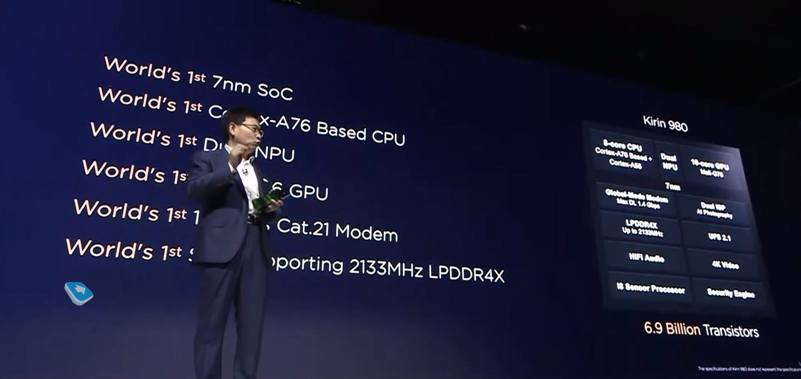 В качестве процессора в Mate 20 (собственно, и в Mate 20 Pro) используется новый чип HiSilicon Kirin 980, разработанный совместно с Taiwan Semiconductor Manufacturing Company. Он построен на 7 нм техпроцессе и имеет 3 кластера: ARM 2xCortex-A76 2.6 ГГц + 2xCortex-A76 1.92 ГГц + 4xCortex-A55 1.58 ГГц. Внутри чипа трудятся целых 6.5 миллиарда транзисторов! Чуть более подробно о процессоре вы можете прочитать в одном из наших материалов.