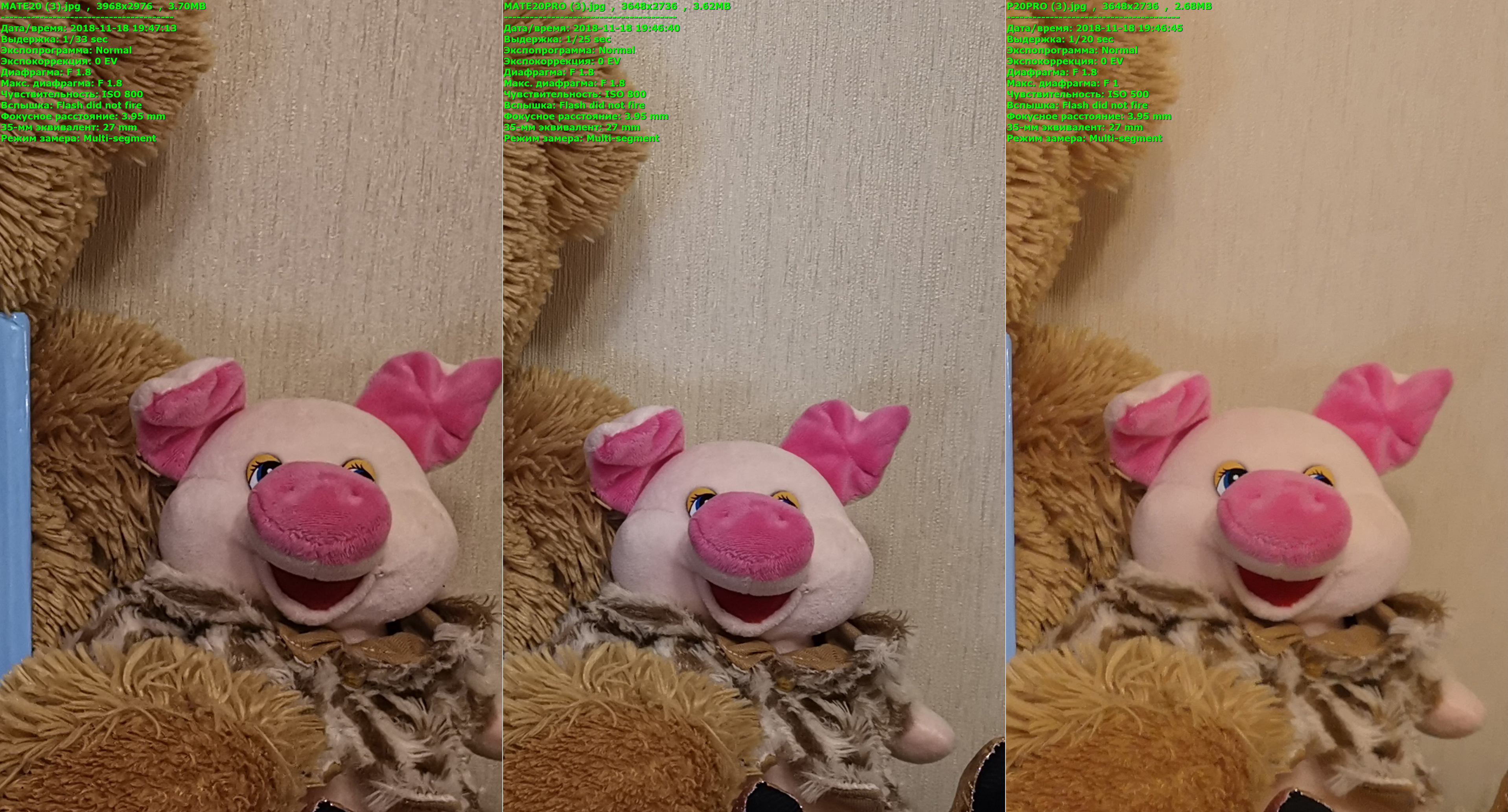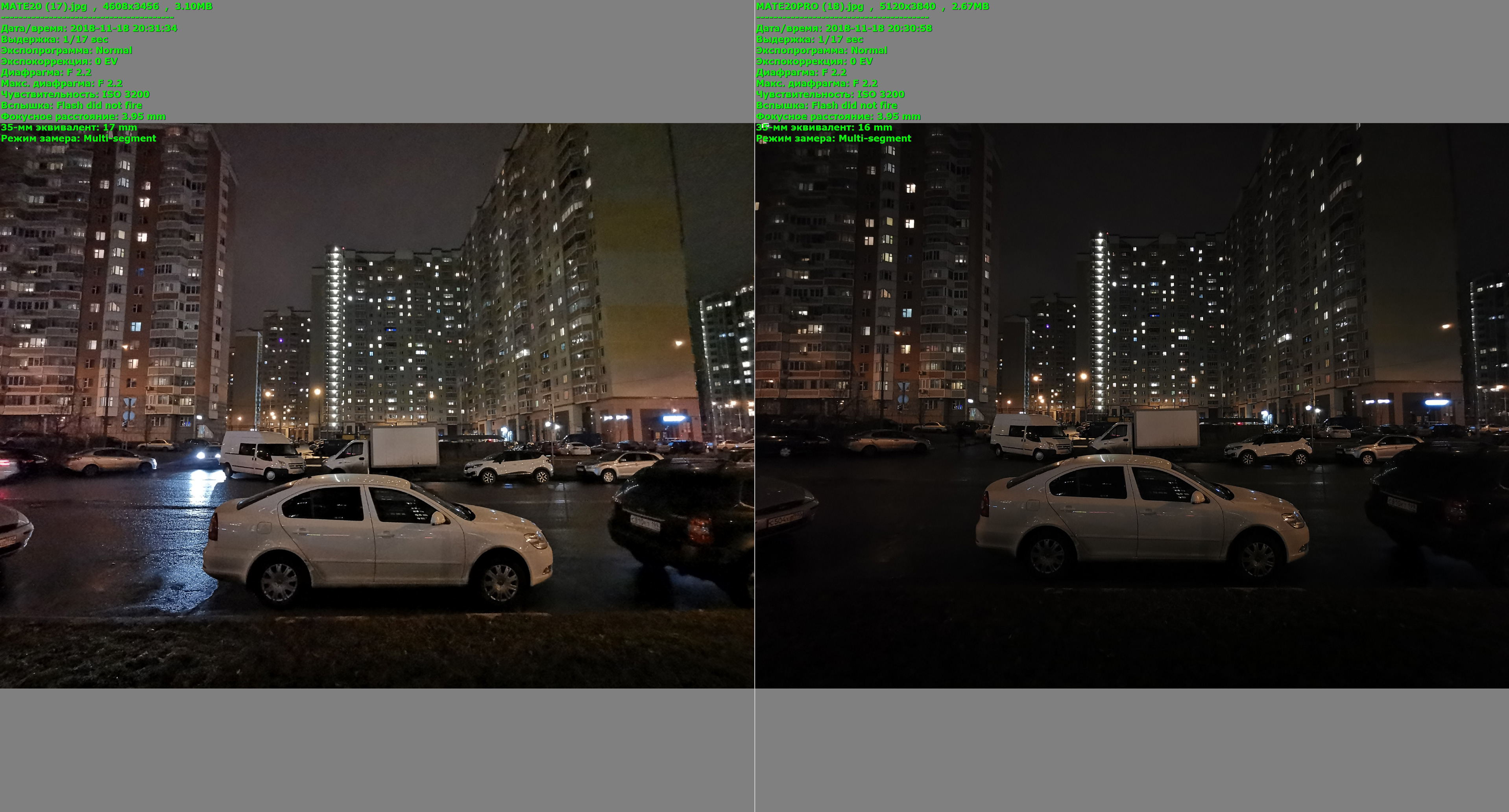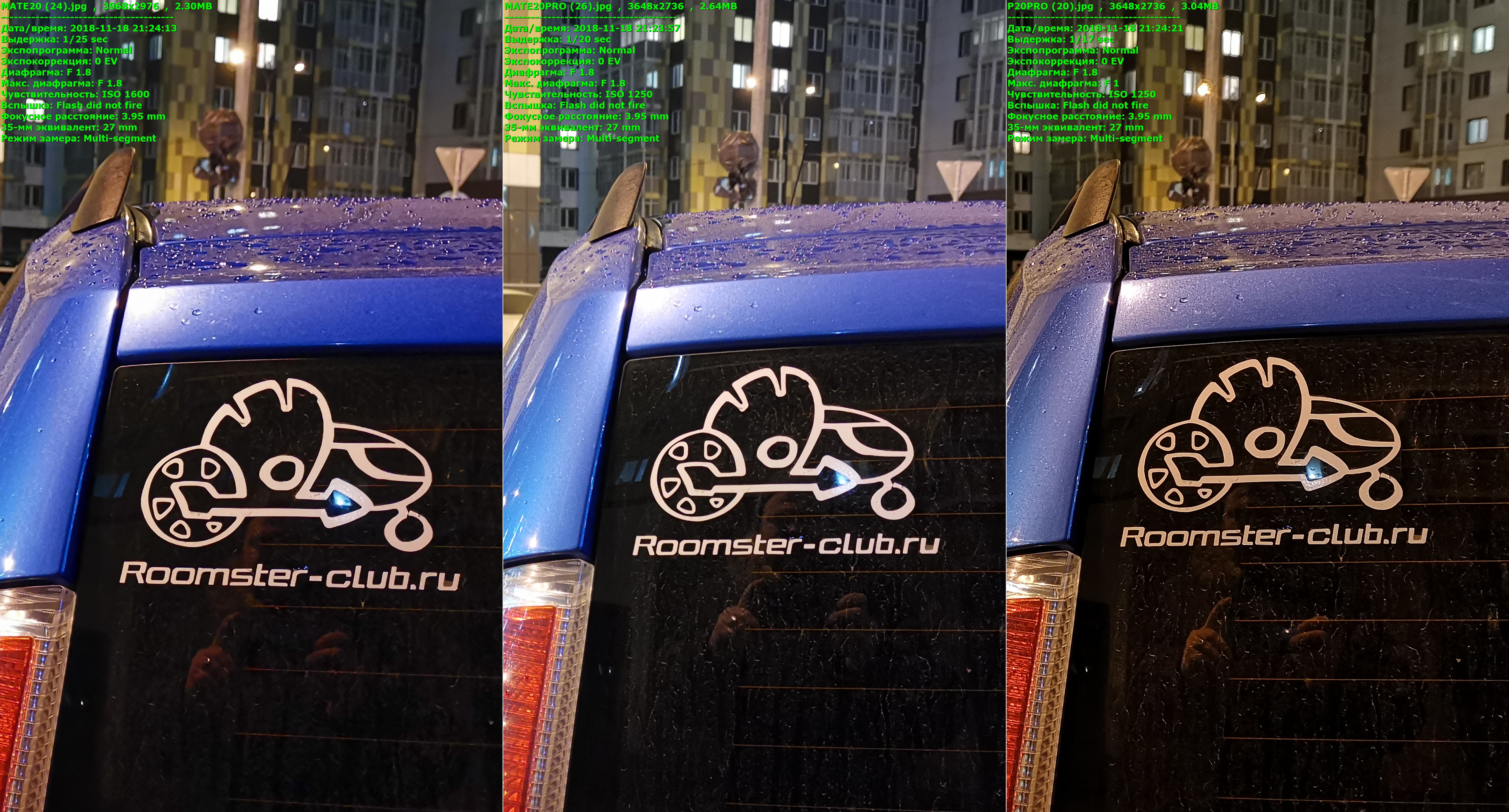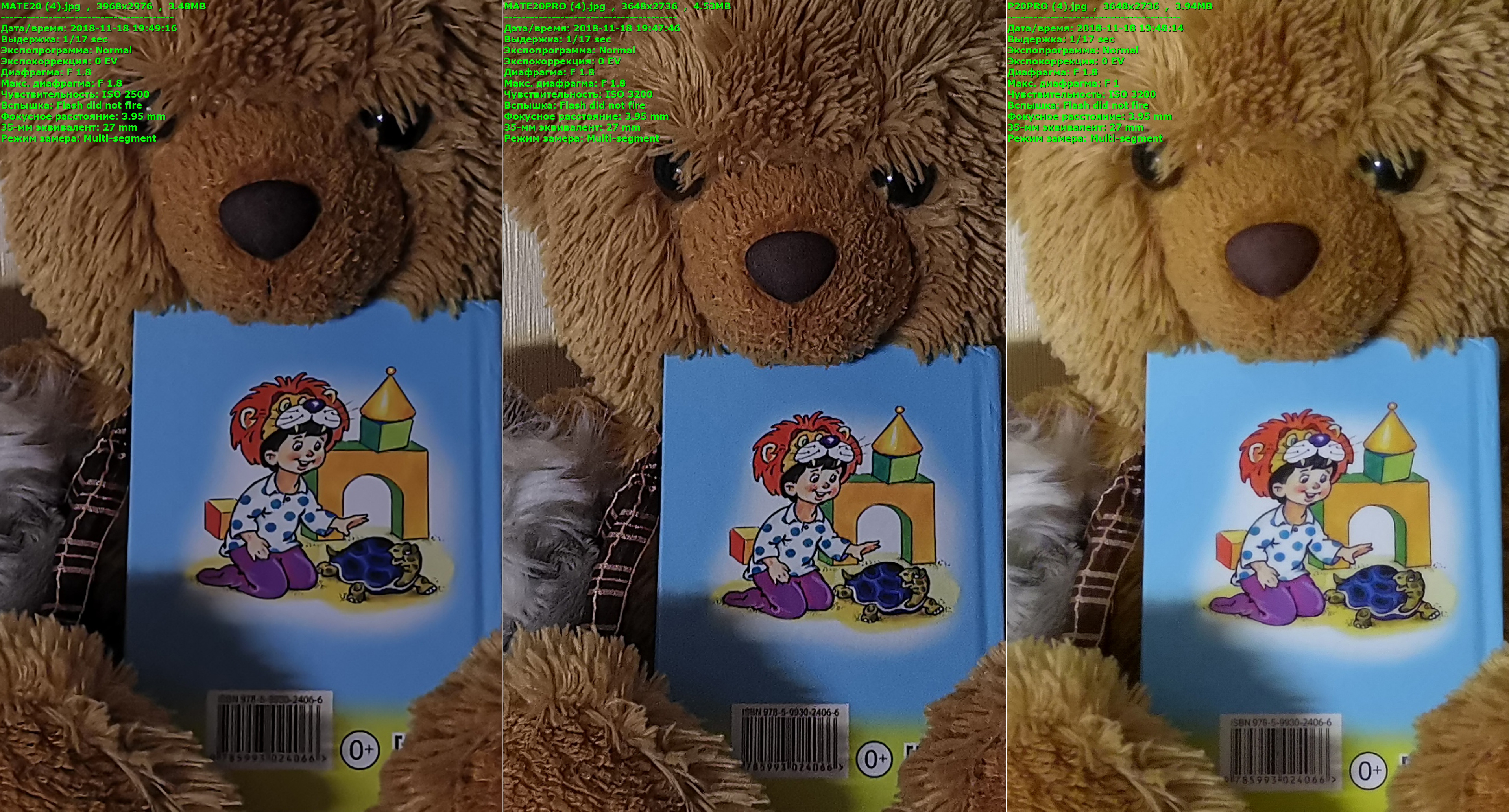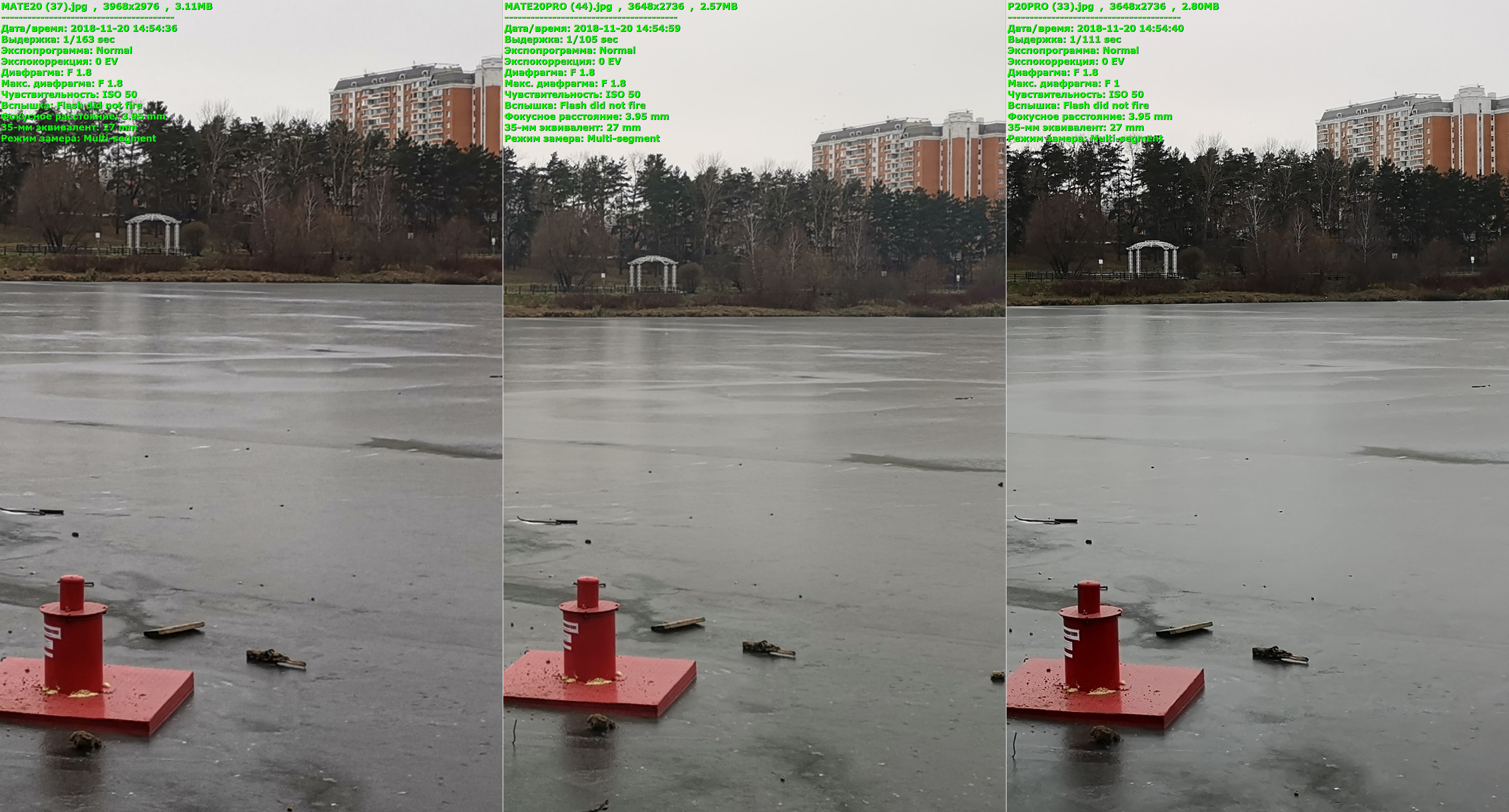 Ссылки на обзоры устройств: Все кадры сняты с рук несколько раз и уже в процессе анализа отобраны наилучшие. В камерах выставлены автоматические настройки с включенным искусственным интеллектом. Стоит заранее пояснить, что на кропах вы заметите немного увеличенный размер кадра, снятого на Mate 20. Это так, поскольку у него разрешение по умолчанию выбрано 12 МП, а у Mate 20 Pro и P20 Pro – по 10 МП. Здесь можно скачать весь архив фотографий (ZIP, 353 МБ) >>> Дневная съемкаФотографии были сняты днем в пасмурную погоду. Фотографы обычно называют такие условия идеальными, так как нет яркого солнца, однако света достаточно, чтобы выдержка была минимальной. На фото – машина, листья и деревья. Автоматика Mate 20 Pro и P20 Pro сработала абсолютно одинаково – ISO 50 и 1/100, а вот Mate 20 решил немного укоротить выдержку до 1/127. Разница небольшая, но у последнего изображение вышло слегка приглушенным. Детализация лучше оказалась у Mate 20 Pro, аппарат P20 Pro решил ее недостаток компенсировать чуть большей резкостью. А Mate 20 снял без какого-либо «шарпинга», фото вышло мягче. Цвета приятнее на кадре, снятом на P20 Pro: они ярче, насыщеннее. Дерево, контровое освещение, достаточно сложный снимок для любой камеры. Здесь лучше всего повел себя Huawei P20 Pro. А дело здесь в том, что у смартфона есть монохромная камера, которая расширяет динамический диапазон. Поэтому в кадре мы видим зеленые иголки, четкий и яркий ствол дерева. Аппарат Mate 20 тоже попытался распознать сцену как «Облака», поэтому и дерево вышло более выразительным. Смартфон Mate 20 Pro не «увидел» здесь ничего интересного, поэтому снимок получился просто неплохим. Детали у всех трех камер примерно одинаковые. Замерзшая река Ликова. С прорисовкой деталей лучше справился P20 Pro: обратите внимание на беседку вдали, на красный металлический люк. Впрочем, возможно, так хорошо сработала контурная резкость. Снимок с Mate 20 ушел в розоватые оттенки, а снимок с Mate 20 Pro – в теплые. Кадры с последних двух воспринимаются примерно одинаково. Плотина или водосброс. Крайне показательная фотография для определения динамического диапазона: светлое небо и темная центральная область. Заметьте, как отлично справился с этой задачей P20 Pro. Однако с точки зрения деталей лучше всего себя повел Mate 20 Pro. Кадр с Mate 20 «ушел» слегка в теплые оттенки, но в целом все равно вышел неплохим. Полено и кусты. Здесь лишь стоит отметить высокую резкость на кадре с P20 Pro. Вероятно, снова помог широкий динамический диапазон ввиду наличия специальной камеры. Дневной снимок на широкоугольные камеры Mate 20 и Mate 20 Pro. Мне понравилась картинка, снятая на Mate 20. Однако сама по себе оптика более широкоугольная именно на Mate 20 Pro. На это тоже стоит обратить внимание. Поскольку фронтальные камеры совершенно одинаковые, получаем примерно одинаковые кадры. Мой семпл Huawei P20 Pro любит теплые оттенки, поэтому в такую пасмурную погоду все равно решил сделать фотографию «как будто тепло». Наиболее натурально снял Mate 20 Pro, а Mate 20 слегка пересветлил. В помещенииЦветок в горшке. Все три камеры определили, что это «Зелень». Поэтому немного приукрасили зеленый цвет. Аппарат P20 Pro решил сделать картинку еще и более контрастной, поэтому детали в тенях потерялись. С точки зрения деталей лучше справился Mate 20 Pro, далее – Mate 20 и P20 Pro. То есть максимально естественно смотрится фото, снятое на Mate 20 Pro. Игрушки, домашнее освещение (г
