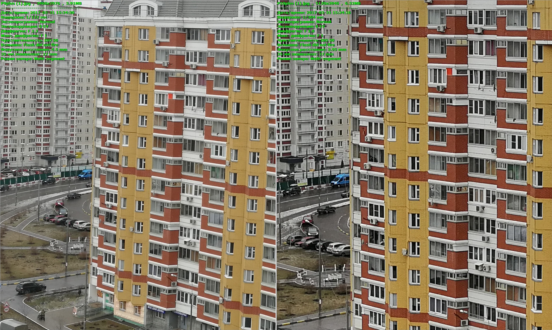 Также здесь есть NFC, остальное стандартно для любого дорогого Android-смартфона: GPS и ГЛОНАСС, Wi-Fi b/g/n, Bluetooth 4.2, USB 2.0 с поддержкой OTG. КамерыВ новинке Huawei P10 Plus используются два основных модуля камер: черно-белый на 20 МП, а цветной – на 12 МП. Объективы SUMMILUX-H с диафрагмой f=1,8. Присутствует лазерная и фазовая фокусировка. Также Huawei оснастила P10 Plus оптической стабилизацией. Если мы говорим о P9 Plus, то там два модуля по 12 МП, диафрагма f=2.2 и нет оптической стабилизации. Скорость фокусировки камеры P10 Plus возросла по сравнению с P9 Plus, баланс белого как был идеальным, так и остался – отличный показатель. Что касается качества картинки, то мне показалось, что новинка снимает хуже предыдущего флагмана. Ниже приведены кропы фотографий. Кадры, снятые на P10 Plus, имеют более высокий контраст, чуть меньше детализация (особенно это заметно на фото с курткой – на P9 Plus видна текстура). Кроме того, камера P10 Plus сильнее «шумит» артефактами. Кстати, если посмотрите на значения ISO и выдержки, то заметите, что P9 Plus ставит значения больше, а P10 Plus – меньше за счет оптической стабилизации, однако, как вы уже поняли, большого толка от этого нет. Фронтальная камера получила сертификацию Leica (8 МП, диафрагма f=1.9). Фокус стал быстрее, фотографии хорошие. Угол обзора стал меньше по сравнению с P9 Plus, контровое освещение воспринимает хуже (сильные засветы). Далее скажу странную фразу, однако также было замечено: селфи мне больше нравились именно на P9 Plus – лица получались более приятные (без эффектов). Что касается размытия заднего плана, то оно осталось прежним с точки зрения качества и работы алгоритмов. На P9 Plus я довольно-таки часто снимаю в этом режиме. Сейчас даже не совсем уже представляю камеры без такого эффекта (в умелых руках можно получить крайне удачные кадры), поэтому рассматриваю к покупке Apple iPhone 7 Plus, а не Samsung S8. Смартфон P10 Plus способен записывать видео в разрешении 4K 30 fps, FHD 30/60 fps.