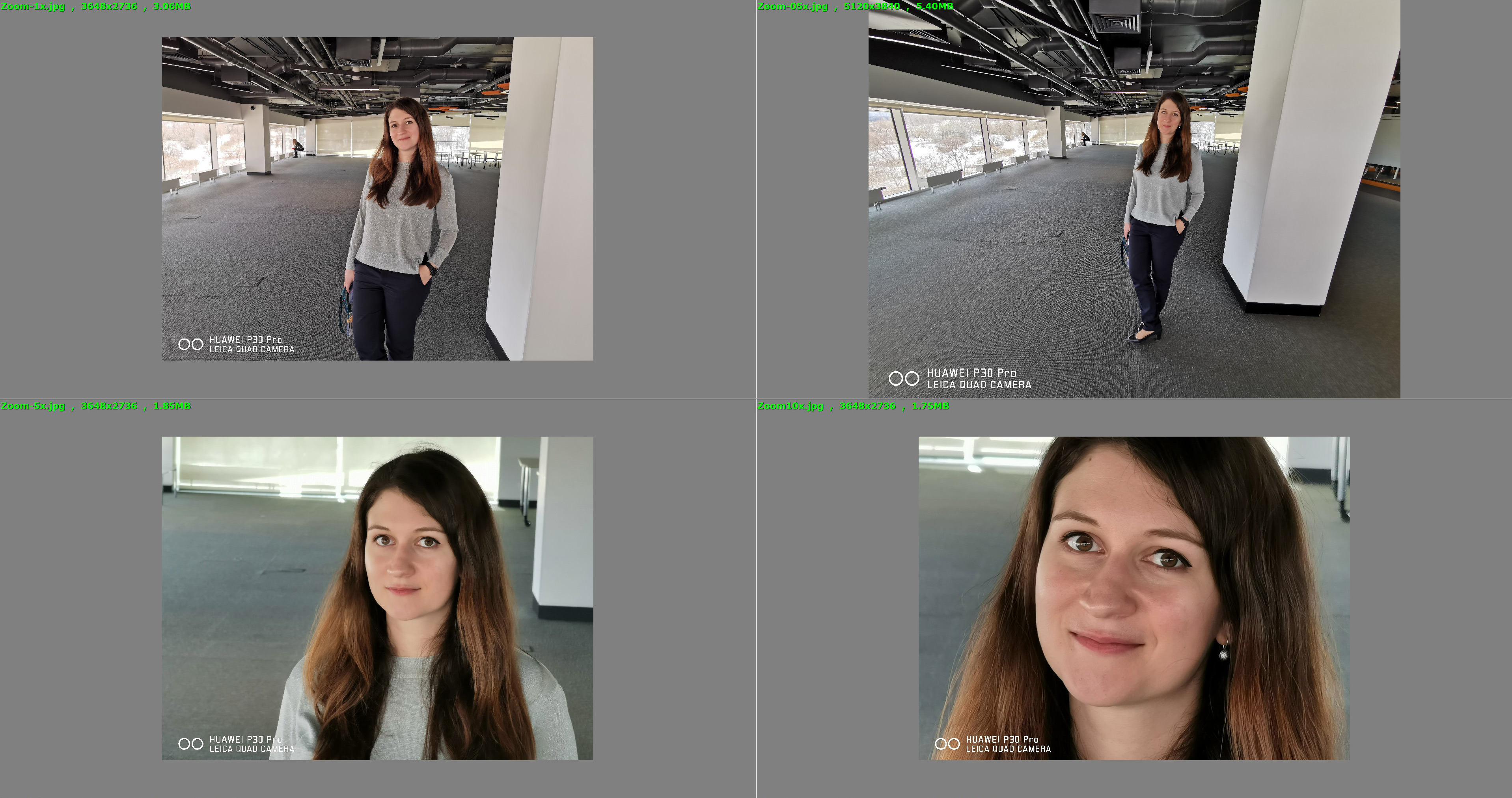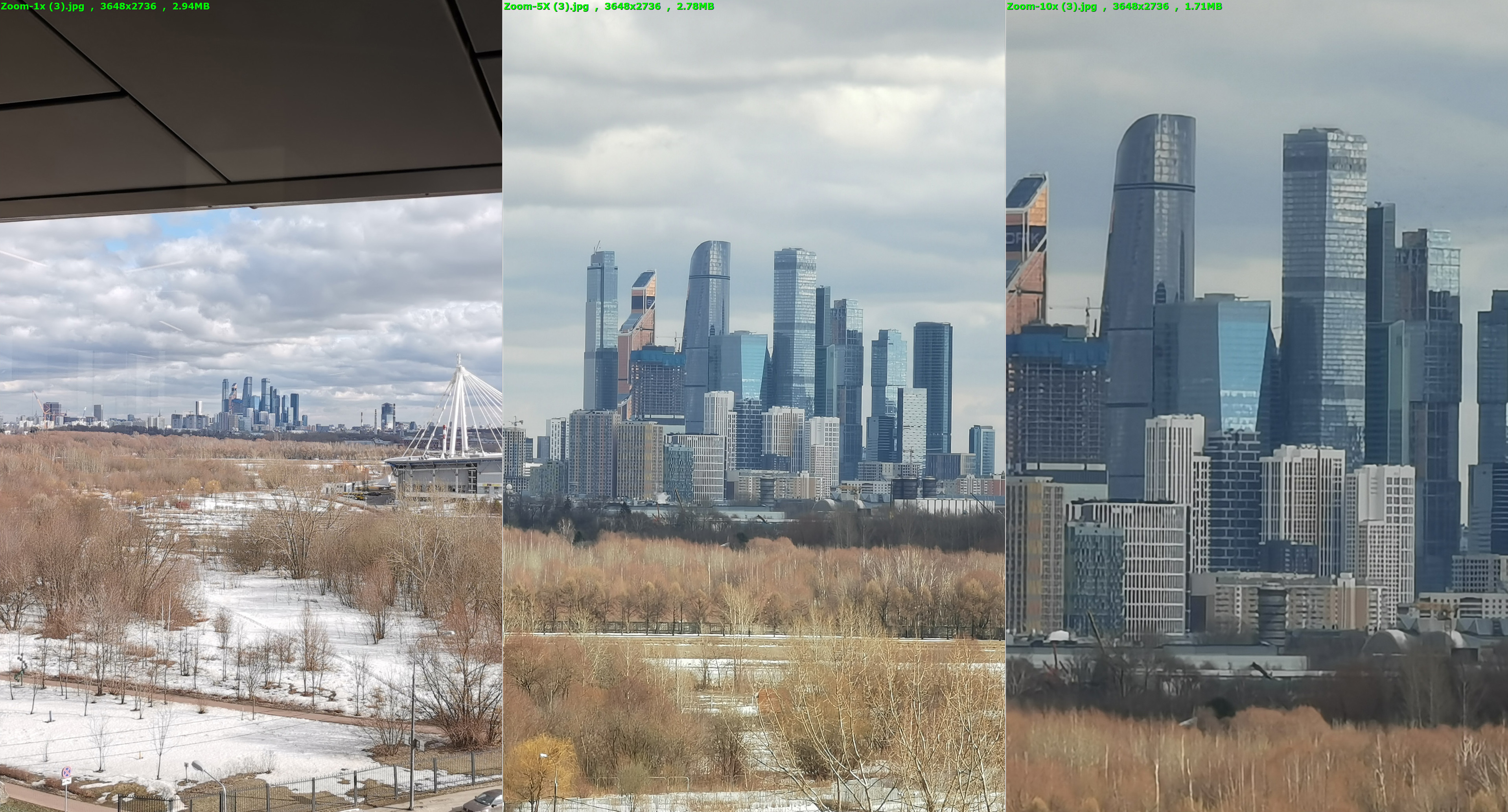 Простыми словами: Huawei P30 оснащен тремя камерами, похожими на камеры Mate 20 Pro, а вот у P30 Pro появилась оптика с 10х гибридным зумом, то есть 5х оптический + интерполяция с использованием ИИ до 10-ти крат. Камера ToF позволяет более точно отсекать фон от объекта съемки. Скорее всего, в ПО встроен 3D-контуринг, как на Honor View 20. Как я писал выше, в камерофоне P30 Pro применили технологии с использованием первого в мире SuperSpectrum Sensor – спектрального сенсора со структурой RYBY (Red+Yellow+Blue+Yellow), позволяющего захватывать на 40% больше света, чем традиционные RGB-датчики. Таким образом, основная камера с этим сенсором должна снимать фотографии и видеоролики в любых условиях освещения, в частности, в темноте. Итак, по слухам, камера Huawei P30 Pro должна была иметь 10-кратную оптику без потери качества, на деле вы получаете камеру с 5-кратным увеличением без потери качества. Судя по всему, линзы внутри корпуса установлены по перископической системе без перемещения. В ПО камеры 4 шага – «ширик», 1Х, 5Х и 10Х. Переключение происходит резко. А что насчет видео? В видео все то же самое – резкое переключение между камерами. Впрочем, можно попробовать воспользоваться зумом, перемещая ползунок увеличения в интерфейсе камеры. В таком случае видео будет плавным, но между переходами камер все равно будет заметен «шов». А что насчет качества фото? Все будет зависеть от уровня освещения: если оно хорошее, то качество выше всех похвал, как только солнышко ушло за облака – будь готов к тому, что 5Х зум превратится в обычный кроп основного модуля на 1Х. На прототипах картинка постоянно скакала между оригинальной съемкой и кропом. Собственно, и на Mate 20 Pro происходит подобная ситуация, только там фокусные расстояния не настолько большие, чтобы разница бросалась в глаза. Типичный пример кропа: кадр слева – основная камера, в центре – как бы 5Х, справа – 10Х. Заметно, что кадр в центре – это простой кроп с основной камеры. А вот фото слева явно сделано на 5Х + интерполяция до 10х. В общем, на концертах (в помещениях) вряд ли вы сможете пользоваться 5-10х зумом без потери качества. Впрочем, посмотрим, что будет в коммерческих образцах. А что насчет стабилизации? Она есть в зум-объективе, кроме того, применяется цифровой стабилизатор. На прототипе иногда «стаб» не срабатывал при съемке видео. В таком случае картинка прилично «шевелилась». В ПО камеры появились функции «Шелковая вода» (без штатива можно превращать бурную реку в плавно текучую воду), MultiView – создание фото/видео с двух объективов одновременно. Замедленное видео записывается по-прежнему – 720р 960 FPS.