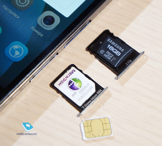 Чуть ниже – два металлических слота. В нижний устанавливается microSIM, а в верхний – nanoSIM или карта памяти microSD. Нынче модно стало делать именно так: либо две симкарты, либо одна, но есть слот под карточку.
