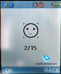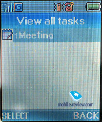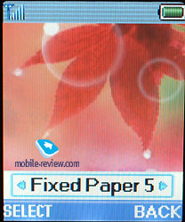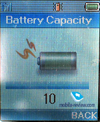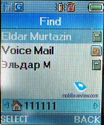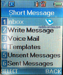 In the sun the screen fades and information may hardly be read, it is characteristic for colour screens in general. The device is equipped with a Li-Pol battery, 760 mAh. And it is used as a back cover of the phone at the same time. Accordig to the manufacturer the battery may work about 145 hours in the standby mode and up to 3 hours in the talk mode. We tested the device in Moscow and it worked in average for 3 days in case of 30 minutes of talk time and up to 15 minutes of using other functions. The full charging time is about 1.5 hours. MenuThe main menu may be called by pressing the left soft-key. The menu is unordinary, it differs from the previous model. There is an always lightened icon of the current menu item in the center. It is possible to move in two directions along the menu and the menu is cyclic itself. All the submenus look like lists. There is a possibility of quick navigation using shorcut number navigation. ![]()