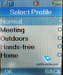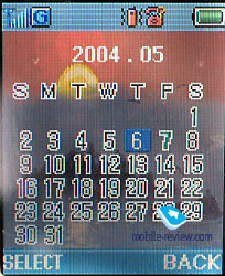 There is an integrated POP3/SMTP client that works without any troubles. Call lists. There is a standard call log of 10 last outgoing, incoming and missed calls. A line is scrolled for a chosen entry showing date and time. Settings. There are profiles that help to change all the settings quickly in the phone. The only shortcoming is that to change a profile one has to appeal to the menu. The thing that also should be stressed considering the settings is a possibility to choose what will be displayed on the screen in the standby mode (the name of the network, date, time and a variation of these parameters). There are various colour schemes of the screen. And traditionally it is offered to choose between analog and digital clock. ![]()
