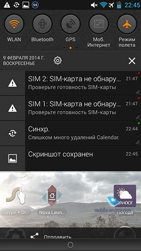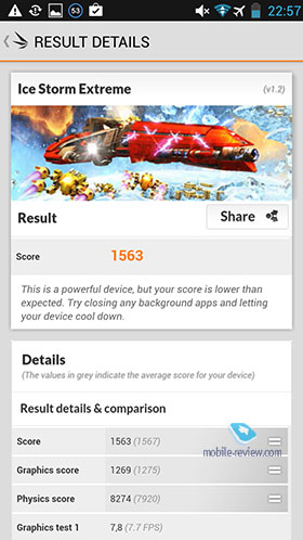 Производитель заменил шторку уведомлений, лаунчер, номеронабиратель, галерею и добавил собственный файловый менеджер. ПроизводительностьУстройство функционирует на чипсете MeidakTek MT6589 с четырехъядерным процессором, работающим на частоте 1,2 ГГц, видеоускорителем PowerVR SGX544, 1 ГБ оперативной памяти и 8 ГБ внутренней (пользователю доступно около 3 ГБ). Первое, что стоит отметить, — небольшой объём оперативной памяти. Сейчас большинство конкурентов уже устанавливает 2 ГБ «оперативки». Второй недостаток — подтормаживания стандартного лаунчера. Тут уж дело в оптимизации оболочки, так как на стороннем Nova Launcher аппарат «летает». И, в-третьих, — малый объём внутренней памяти, всё же, за свою стоимость в аппарат могли установить и более емкий накопитель.