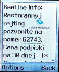 If you assigned a picture to a name, you could see it in the list too. Photos (48õ48 pixels) could be added to special names. Images of larger resolution are not visible in the list, one can’t select them. Unfortunately pictures of available resolution are badly recognized, and there is no sense to associate them with entries. One can select icon or ringtone for a caller group. It’s possible to adjust speed dialing (keys 2-9). Notify that a phone number showul present in the phonebook to add it to speed dialing list. One can choose any phone number type. Voice tags can be added up to 10 phone numbers. The recognition operates quite well. If you decide to add two equal voice tags, the phone warns you about it. Messages. The phone supports not only SMS-messages but EMS-as well. There are pre-default messages and up to 10 changeable templates. These functions are standard to all modern phones from LG. ![]()