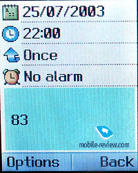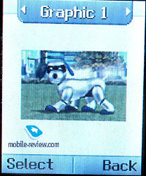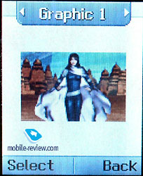 The phone is produced in several colors. Now it is known that there will be phone of silver, red and blue colors. The handset is large, it doesn’t relate to the phones of small dimensions, so we could consider it as a “men’s phone”. We can’t recommend it to ladies. Real dimensions of the phone are 92õ50õ24 mm (106mm with antenna), according to the manufacturer the dimensions are a little bit different: 89õ46õ24 mm. Weight of the phone is not large, only 99 g. It is almost not felt in hands, especially if to take into account its size. External screen in the stand-by mode looks and serves as a mirror. We do not think that this function is so necessary for men. Mirror surface quickly becomes dirty and it is one of the disadvantages of such kind of surfaces. The second shortcoming is that OLED-screen is located under this mirror cover and the picture is not bright even inside. Type of the screen is equal to the one which was in G7030, it supports up to 256 colors. In sunny days the information is almost not visible and you need to find a special angle to read or see something. Time and service information are displayed on the screen in the standby mode. Pressing of side keys allows viewing the current date and the second pressure - animated picture. There are several pre-installed animated pictures in the phone. You could view them in the stand-by mode just for entertainment. The set of pictures is smaller than in LG G7030. Among menu settings you can adjust font color of the external screen, time of picture displaying, two types of brightness (muted and bright). The brightest backlight is set by default, it is one of the most comfortable ones, though often it is not enough. ![]()