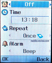 Settings. The first menu item is alarm clock. It could ring once, daily, weekly or monthly. Among other interesting settings we can mention a possibility to choose wallpaper for internal screen and adjust settings of the external screen. Other things are standard.