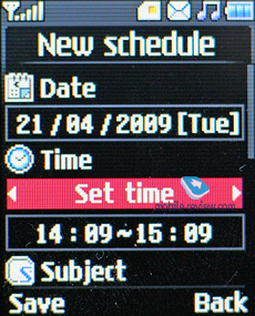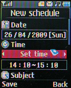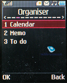 Органайзер. В календаре возможен просмотр только по месяцам. В памяти аппарата может храниться до 100 событий. Возможности календаря невелики. Для события вы задаете дату и время, записываете тему, выставляете по необходимости звуковое оповещение, срок действия события, а также периодичность повтора.