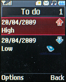 Задачи. Практически то же, что и события в календаре, только имеется возможность установить приоритет. В телефоне может храниться максимум 50 задач.