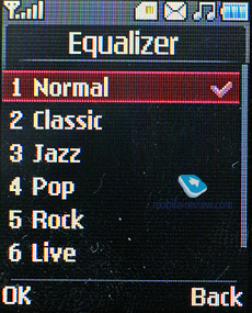Плеер. В главном меню плеера вы можете видеть несколько строк, все песни, а также плей-листы. Выбирать можно папки с карты памяти. Проигрыватель аппарата сканирует всю память телефона и внешнюю память на предмет музыкальных файлов, так что совершенно не принципиально, где и в какой папке или подпапке находятся композиции, аппарат их все равно найдет, но выбрать для проигрывания нужную папку вам придется руками. Музыкальный проигрыватель может работать со следующими типами музыкальных файлов: MP3, AAC, AAC+, eAAC+ и WMA. Русскоязычные теги отображаются в аппарате без особого труда. В настройках плеера можно выбрать два вида отображения во время проигрывания (скин). Есть 7 типов эквалайзеров.