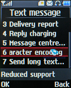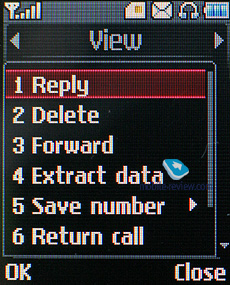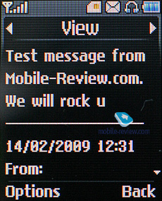 Сообщения. Кроме SMS аппарат поддерживает и стандарт EMS, в памяти телефона уже предустановлен набор небольших картинок и звуков. Телефон поддерживает работу со склеенными сообщениями, максимально допустимый размер сообщения составляет 1600 знаков. При наборе сообщения в верхней строчке вы можете видеть количество доступных и использованных символов, а также количество использованных сообщений и их допустимый предел. В тело сообщения можно вставить имя и номер телефона из телефонной книги, а также использовать один из доступных шаблонов. Всего в памяти аппарата изначально предустановлено пять шаблонов, но пользователь вправе создать еще пять, а также он может изменять уже существующие шаблоны по своему усмотрению.