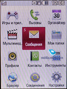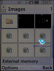 Мои папки. Простой файл-менеджер, в котором можно просмотреть информацию, хранящуюся как в памяти аппарата, так и на карте памяти. К сожалению, на просмотр в аппарате имеются ограничения, так, в данном файл-менеджере отображаются только папки, созданные телефоном (Изображения, Звуки, Видео и Другие), то есть увидеть информацию, сохраненную в другой папке, которая по имени отличается от установленных аппаратом, никак нельзя. Файл-менеджер поддерживает простые действия с объектами, это копирование и перенос, сортировка объектов по имени, дате или типу файлов, а также переименование файлов.