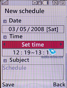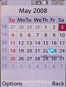 ![]() Органайзер. В календаре возможен просмотр только по месяцам. В памяти аппарата может храниться до 100 событий. Возможности календаря невелики. Для события вы задаете дату и время, записываете тему, выставляете по необходимости звуковое оповещение, срок действия события, а также периодичность повтора.
