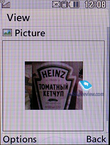 Качество снимков, сделанных встроенной камерой телефона, не блещет. В темное время суток или при плохом освещении они получаются весьма шумные, более-менее нормального качества можно добиться только при съемке при хорошем освещении, да и то качество все равно будет далеко от идеала. В фотоальбоме снимки отображаются в виде матрицы 3х3, загружаются миниатюры достаточно долго, более 10 секунд. Также возможен просмотр снимков по одному на полный экран, есть и функция слайд-шоу, в этом случае все снимки будут отображаться поочередно. Выбранную фотографию можно сразу отправить в печать через Bluetooth либо отправить снимок по Bluetooth на другое устройство, либо посредством MMS или электронной почты.