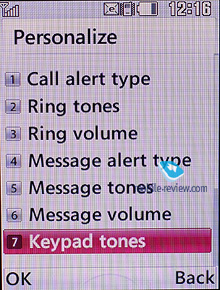 ![]() Профили. В аппарате пять профилей, три из которых полностью настраиваются пользователем, а два оставшихся никаких настроек не имеют (тихий и вибрация). Для голосового вызова вы можете установить любую мелодию, как свою, так и из набора уже предустановленных в телефоне. Также вы можете выбрать тип оповещения, это может быть: только звонок, только виброзвонок, звонок и вибрация одновременно, звонок после вибрации, а также полностью бесшумный режим. Для сообщений вы можете выбрать мелодию только из набора предустановленных (всего 10 штук), также возможно установить тип оповещения для сообщений, это: один звонок, периодический, звонок и вибрация, виброзвонок и полностью бесшумный режим. Кроме этого, в настройках профилей возможно настроить звук и для других действий с телефоном.
