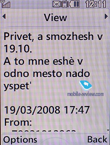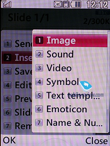 Аппарат поддерживает мультирассылку сообщений одновременно по 10 номерам. Редактор MMS-сообщений прост и понятен в работе, все настройки выполняются через всплывающее меню. Максимальный объем исходящего сообщения не может превышать 300 Кб. Как и для текстовых сообщений, для MMS пользователь может создать собственные шаблоны.