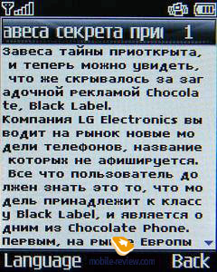 We won’t particularize each item on the menu, because you can read exactly the same facts in reviews of P7200, M6100, M4410 – we’d rather focus your attention on the most interesting capabilities, as the only distinguishable difference between the Chocolate Phone and an ordinary LG phone is extended standby mode, featuring fast access menu, similar to that of Motorola or Nokia (Series 40 Third Edition).