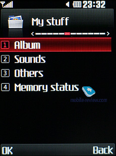 Мои папки. Простой файл-менеджер, в котором можно просмотреть информацию, хранящуюся как в памяти аппарата, так и на карте памяти. К сожалению, на просмотр в аппарате имеются ограничения, так, в данном файл-менеджере отображаются только папки, созданные телефоном (Изображения, Звуки, Видео и Другие), то есть увидеть информацию, сохраненную в другой папке, которая по имени отличается от установленных аппаратом, никак нельзя. Файл-менеджер поддерживает простые действия с объектами, это копирование и перенос, сортировка объектов по имени, дате или типу файлов, а также переименование файлов.